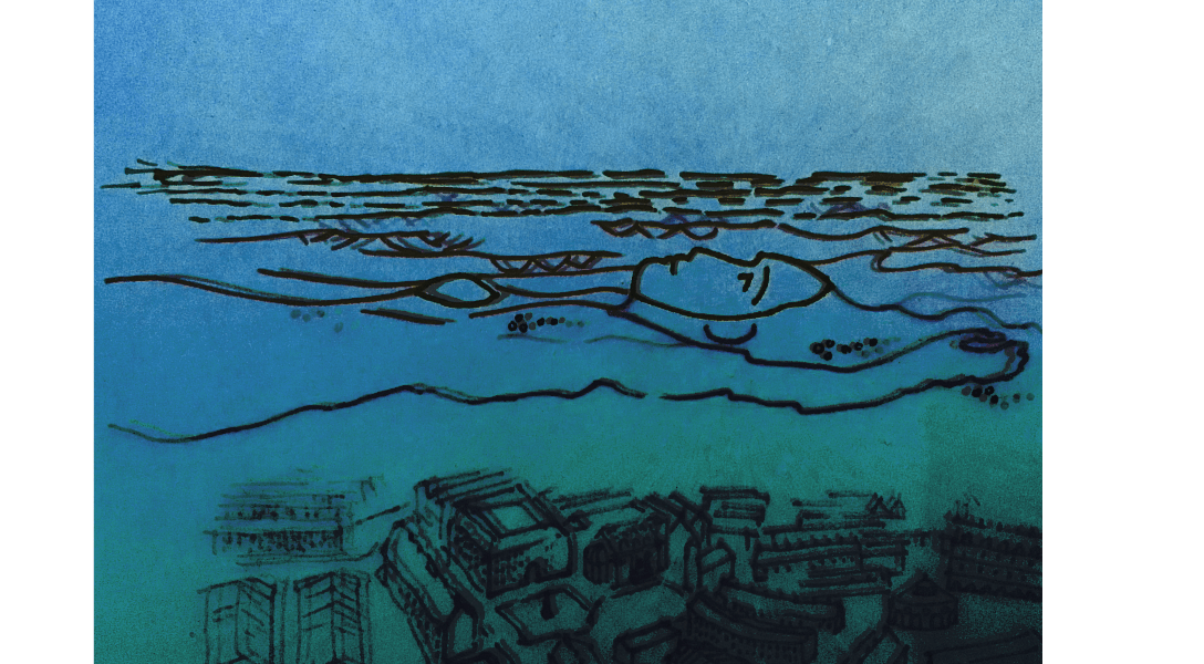 I drew this thinking of those curious worlds, sunken typically to make way for hydro-electric schemes. It has the same appeal of the desert village. Maybe even more appeal, as it is not easily visited. In this dark and murky world, your imagination can take hold and it can become something altogether fantastic and different. Or perhaps terrifying.